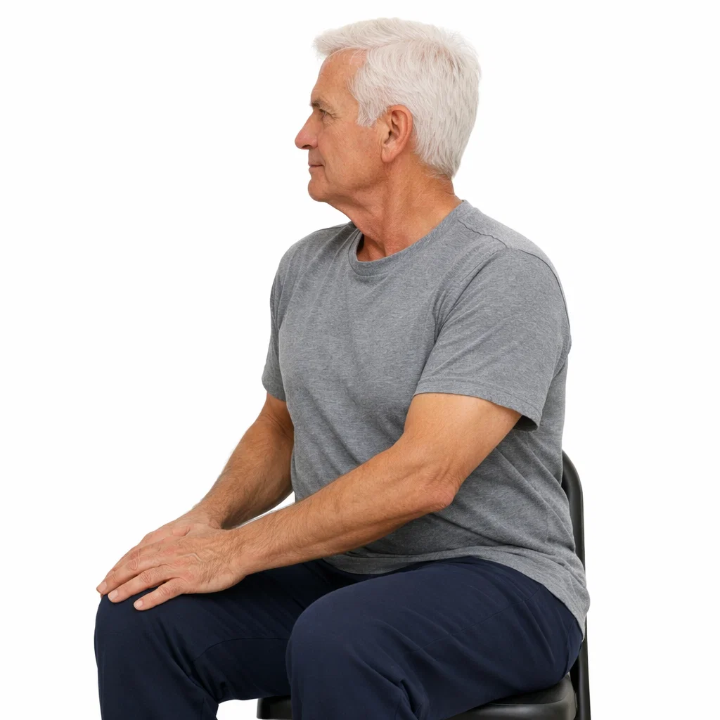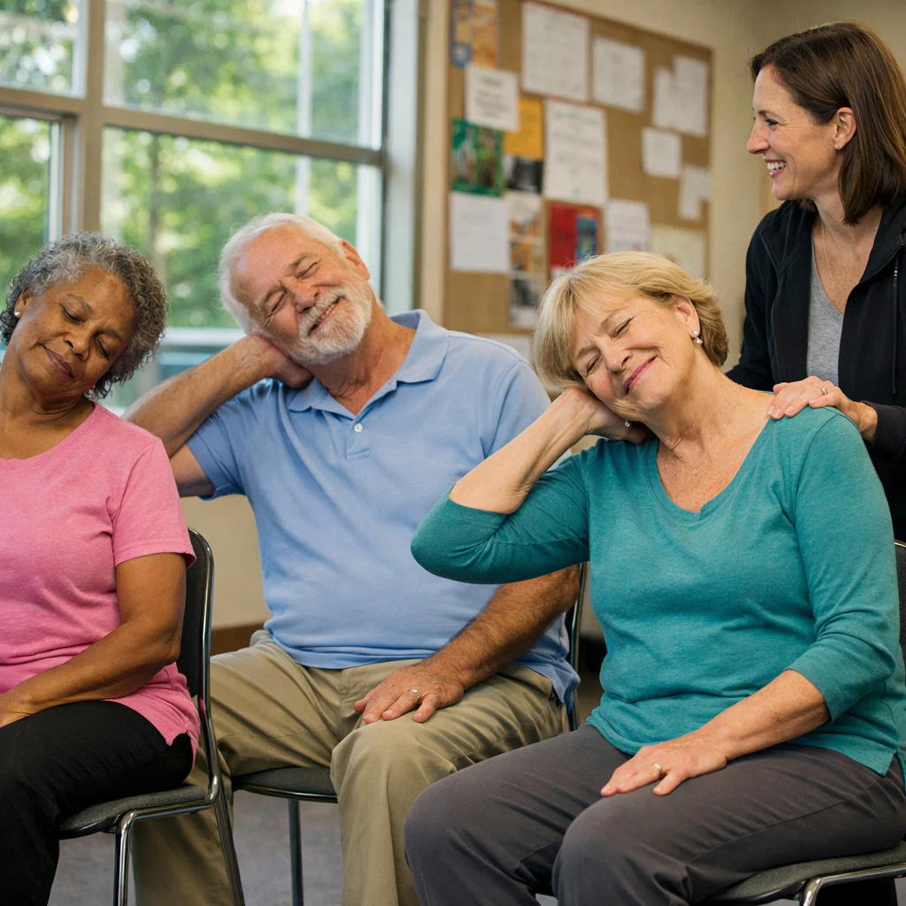 Practice 10 minutes daily doing simple seated stretches. Focus on neck rolls, shoulder rolls, and gentle twists.
